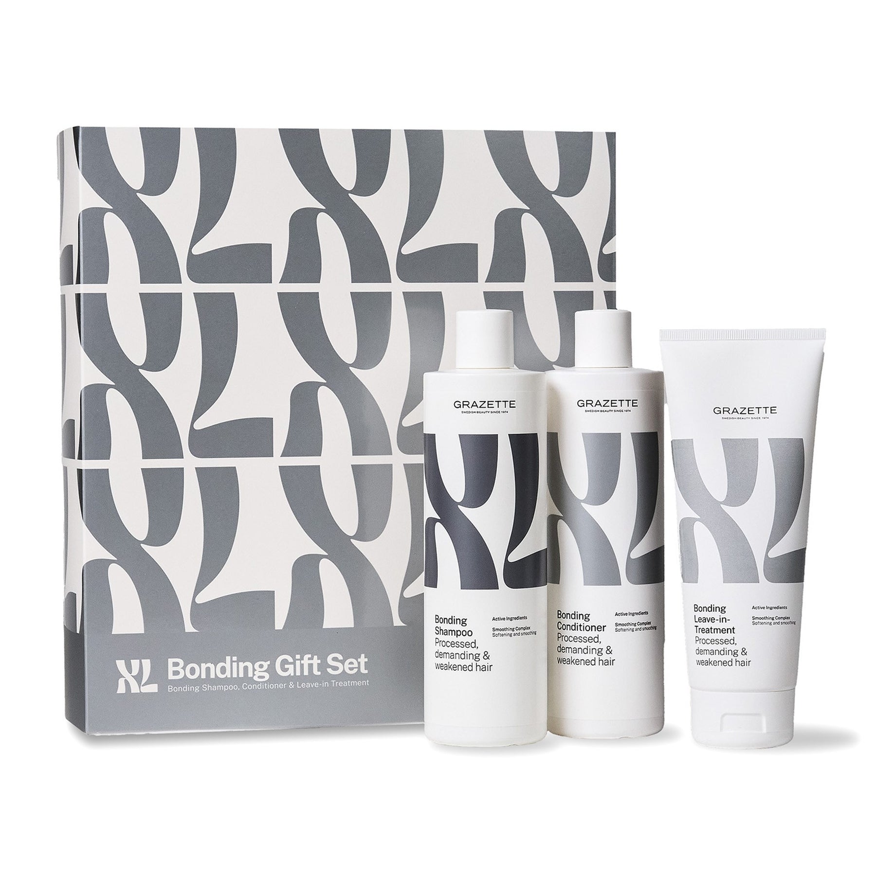 Den här gåvoboxen innehåller hårvårdsprodukter från XL Bonding-serien som reparerar försvagade bindningar och gör håret mjukt och följsamt. Dessutom gör produkterna håret slätt och tar bort friss. Alla produkter är 100% veganska.